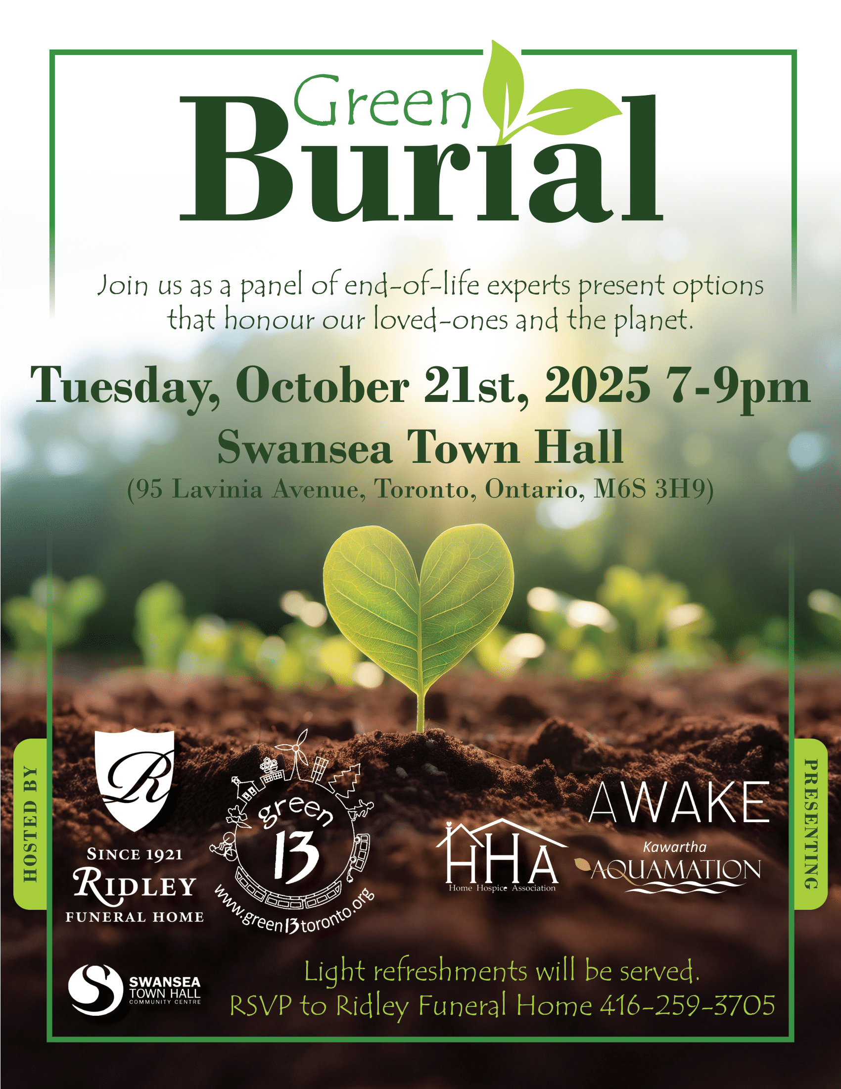 The event is co-sponsored by Green 13, Swansea Town Hall, Ridley Funeral Home, AWAKE Kawartha Aquamotion, and Home Hospice Association.