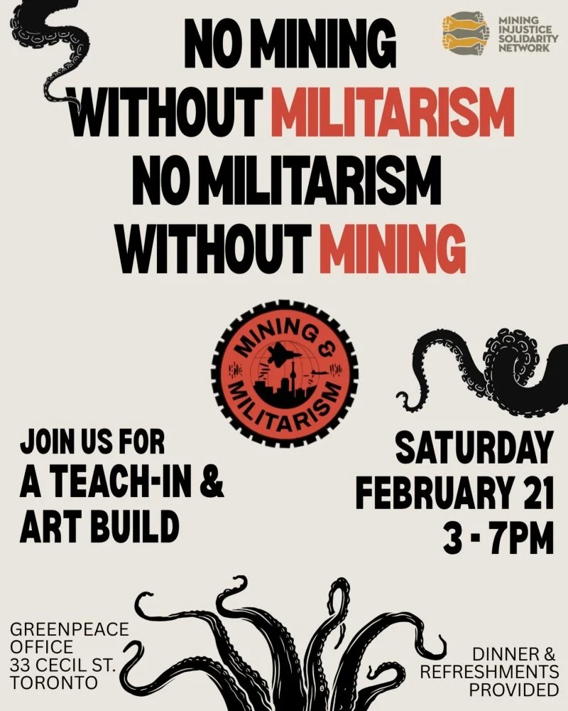 We will be discussing the links between mining and militarism, Canada’s role in the global mining industry, and why it is so critical for us to disrupt PDAC 2026! We would love to hear from you and your communities about your concerns around mining and militarism.
