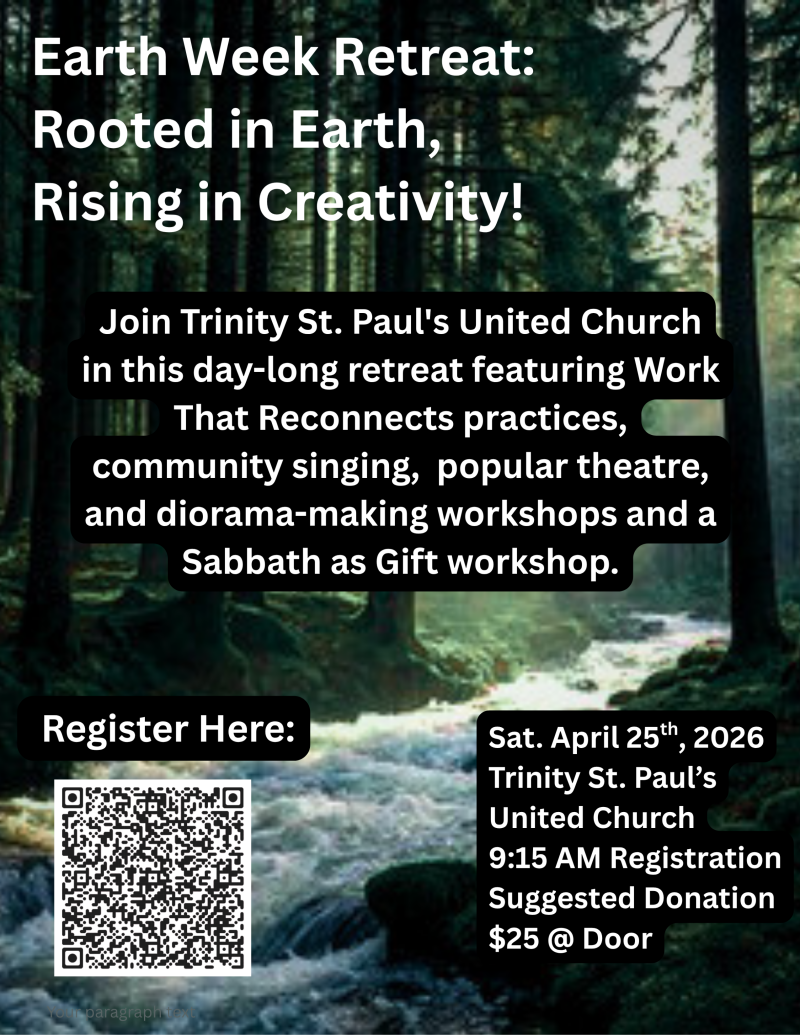 Join Trinity St. Paul's United Church community as we explore our relationship with the Earth, honour our feelings about the climate crisis, nurture and renew our spirits, and get inspired for healing work in the world. The day will feature Work that Reconnects practices, singing in community, creative arts workshops, and a workshop about sabbath as gift.