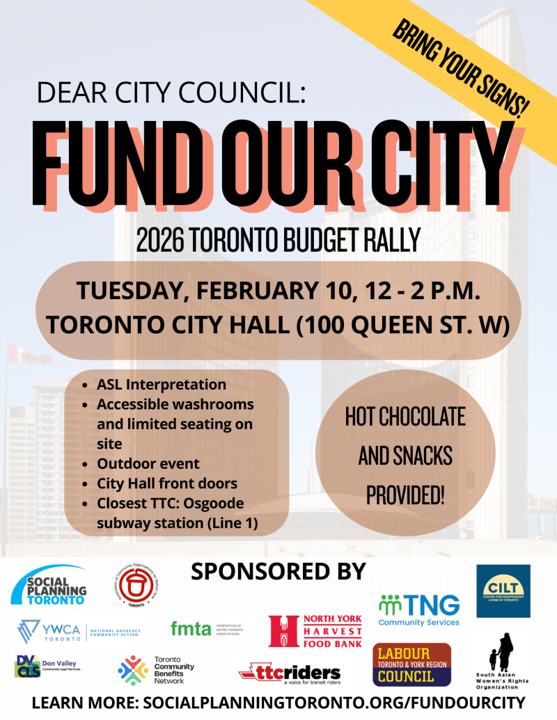 On February 10, Toronto City Council will be voting on the 2026 City Budget. Social Planning Toronto and partners are organizing a community rally outside City Hall to let Council know this is no time for cuts.
