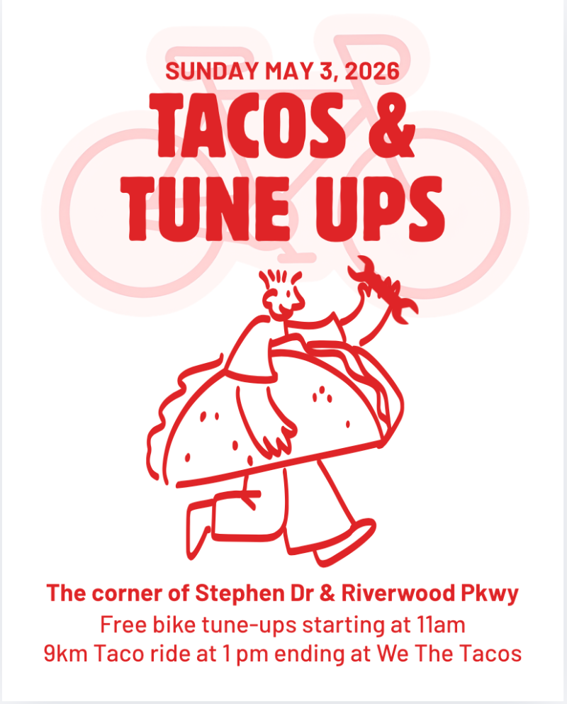 11am to 1pm: bike tune ups (free). At 1pm we will bicycle from start point along Humber River to Bloor then south on Royal York to a taco shop on Lakeshore Ave.