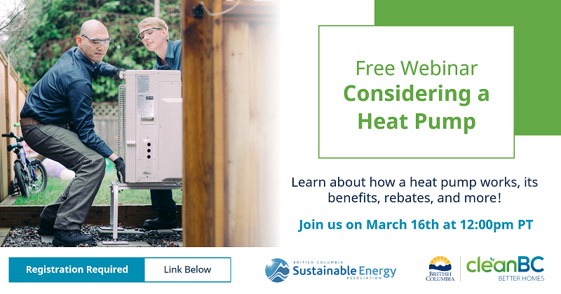 Considering a Heat Pump? Wednesday, March 16, 2022 3:00 PM 5:00 PM Digital Event (map) Google Calendar ICS Join our free webinar to learn what a heat pump is, the benefits of heat pumps, how to find a registered contractor, and what rebates, financing offers, and supports are available to help you upgrade your heating system.https://zoom.us/webinar/register/WN_pyWP9wh1R3CPDgrjSl11Cw