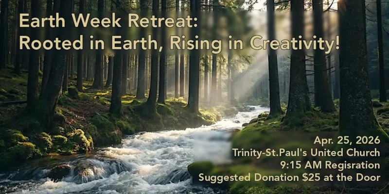 Join Trinity St. Paul's United Church for an Earth Day Retreat on Saturday, April 25th, Rooted in Earth, Rising in Creativity! This day-long retreat will be an opportunity to explore our relationship with the Earth, honour our feelings about the climate crisis, nurture and renew our spirits, and get inspired for healing work in the world.