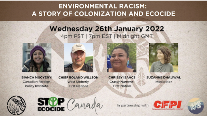 In this third discussion, we will hear stories from the frontlines, centered on environmental racism, the ongoing impacts of colonisation and how it connects with ecocide, the mass destruction of nature. We will be meeting with Chief Roland Willson of West Moberly First Nations and a strong advocate opposed to Site C dam, Chrissy Issacs of Grassy Narrows First Nation and long-time activist of mercury justice, and Bianca Mugyenyi, author, activist and Director of the of Canadian Foreign Policy Institute. The webinar will be moderated by Suzanne Dhaliwal, climate justice creative, campaigner, researcher, lecturer in environmental justice and trainer in creative strategies for decolonisation.