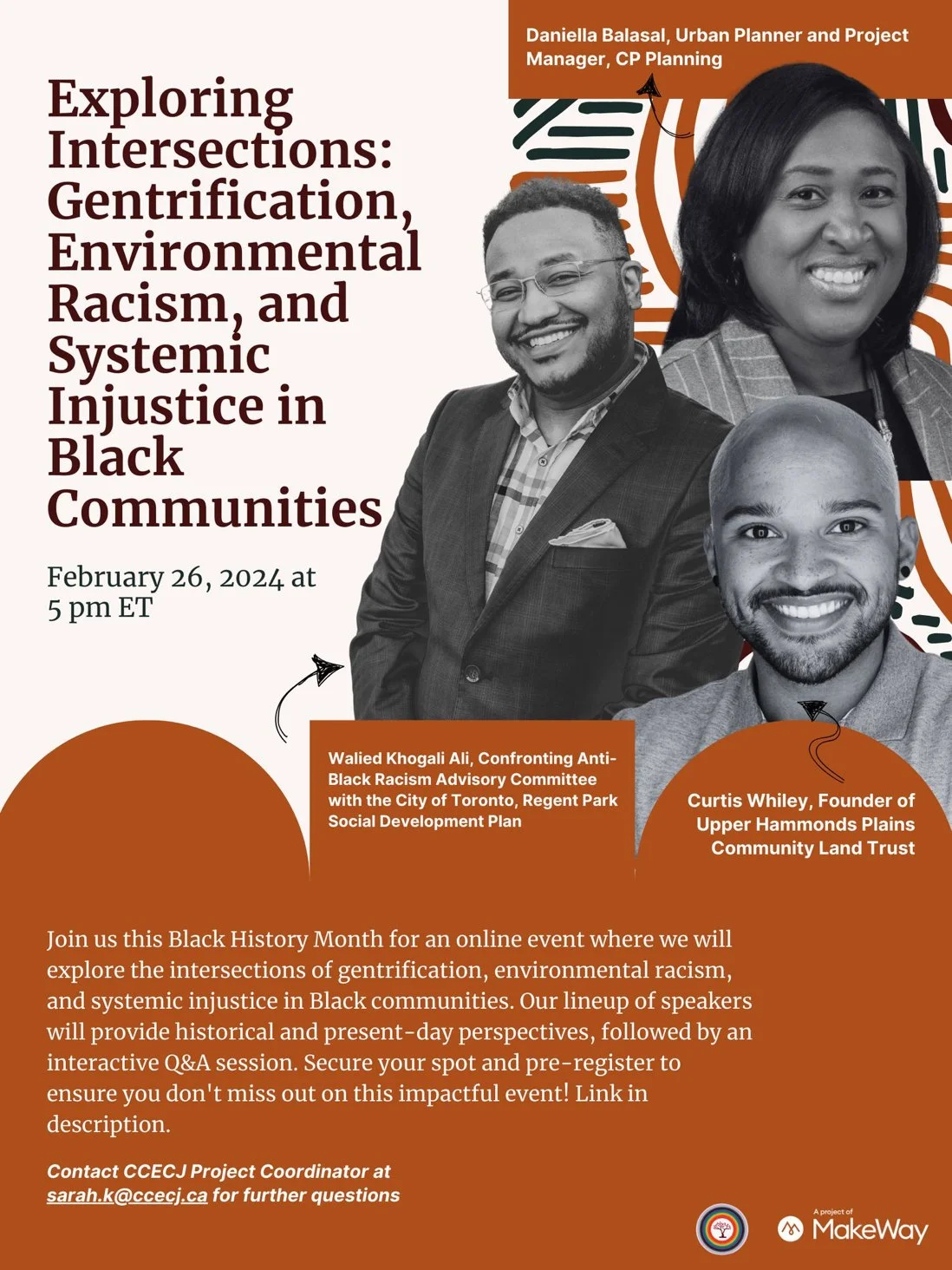 Join us this Black History Month for an online event where we will explore the intersections of gentrification, environmental racism, and systemic injustice in Black communities. Our lineup of speakers will provide historical and present-day perspectives, followed by an interactive Q&A session. Secure your spot and pre-register to ensure you don't miss out on this impactful event! Link in description.