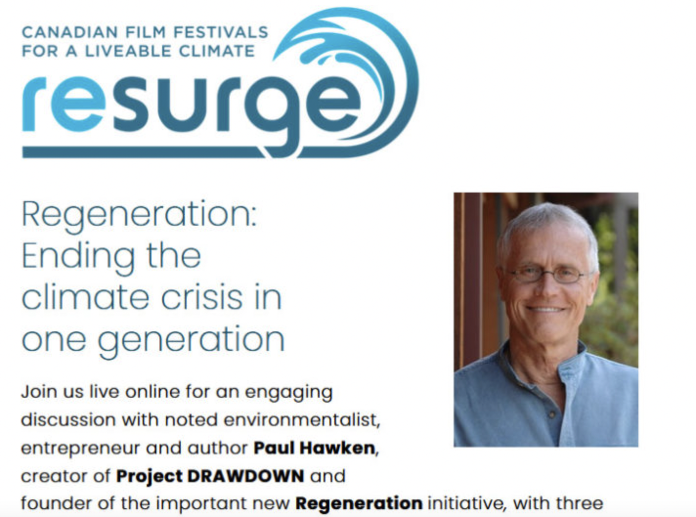 Drawdown Toronto, Drawdown Alberta, Drawdown BC and Water Docs are excited to present an evening with Paul Hawken. Paul is joining us to talk about his latest book, Regeneration: Ending the Climate Crisis in one Generation, and will be engaged in conversation with three important and exciting Canadian environmental voices: Allie Rougeot, Bryanna Brown and Melanie Hoffman, who each bring their unique experiences and perspectives.