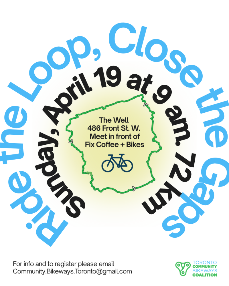Join us for a 72 km bike ride along The Loop -- an almost complete circuit of bike trails running along the waterfront, Humber River, Finch Hydro Corridor and Don River. The objective is to show people the potential of a closed loop -- for recreation, tourism, and utilitarian cycling --- and to advocate for closure of the gaps.