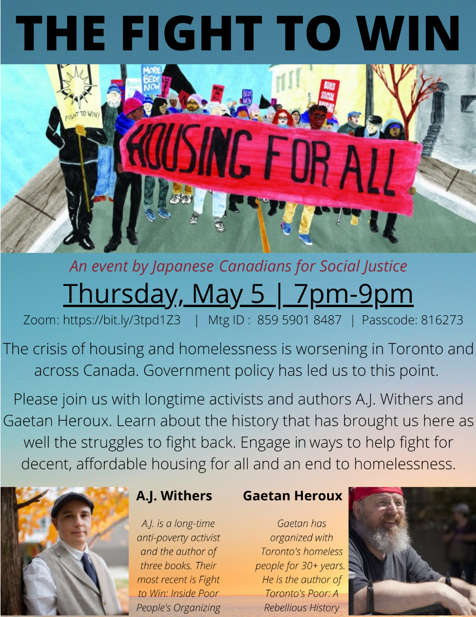 Please join us with longtime activists and authors A.J. Withers and Gaetan Heroux. Learn about the history that has brought us here as well as the struggles to fight back. Engage in ways to help fight for decent, affordable housing for all and an end to homelessness.