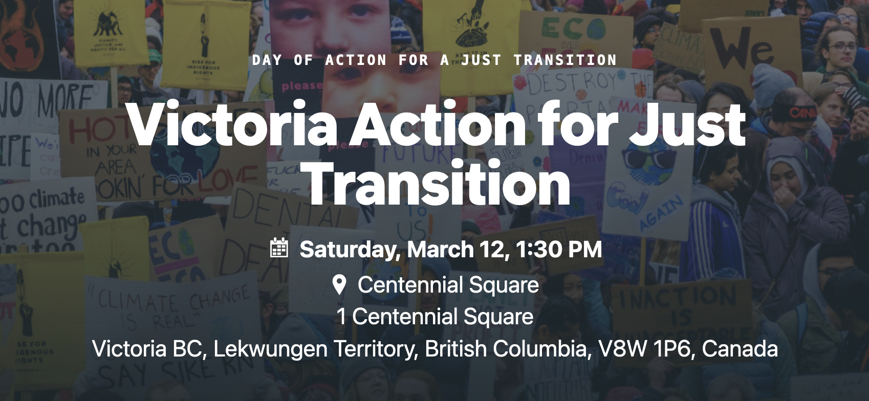 It’s been nearly 3 years since Justin Trudeau first promised a Just Transition Act and we’ve barely seen any action. Join us and demand a big, bold Just Transition that works for everyone. Details to be confirmed. Please bring and wear a good quality mask. Organized by Climate Justice Victoria - www.climatejusticevictoria.ca