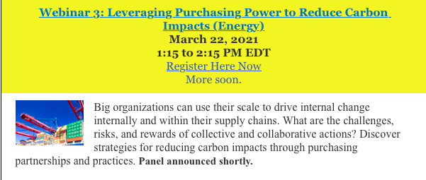 Big organizations can use their scale to drive internal change internally and within their supply chains. What are the challenges, risks, and rewards of collective and collaborative actions? Discover strategies for reducing carbon impacts through purchasing partnerships and practices. Panel announced shortly.