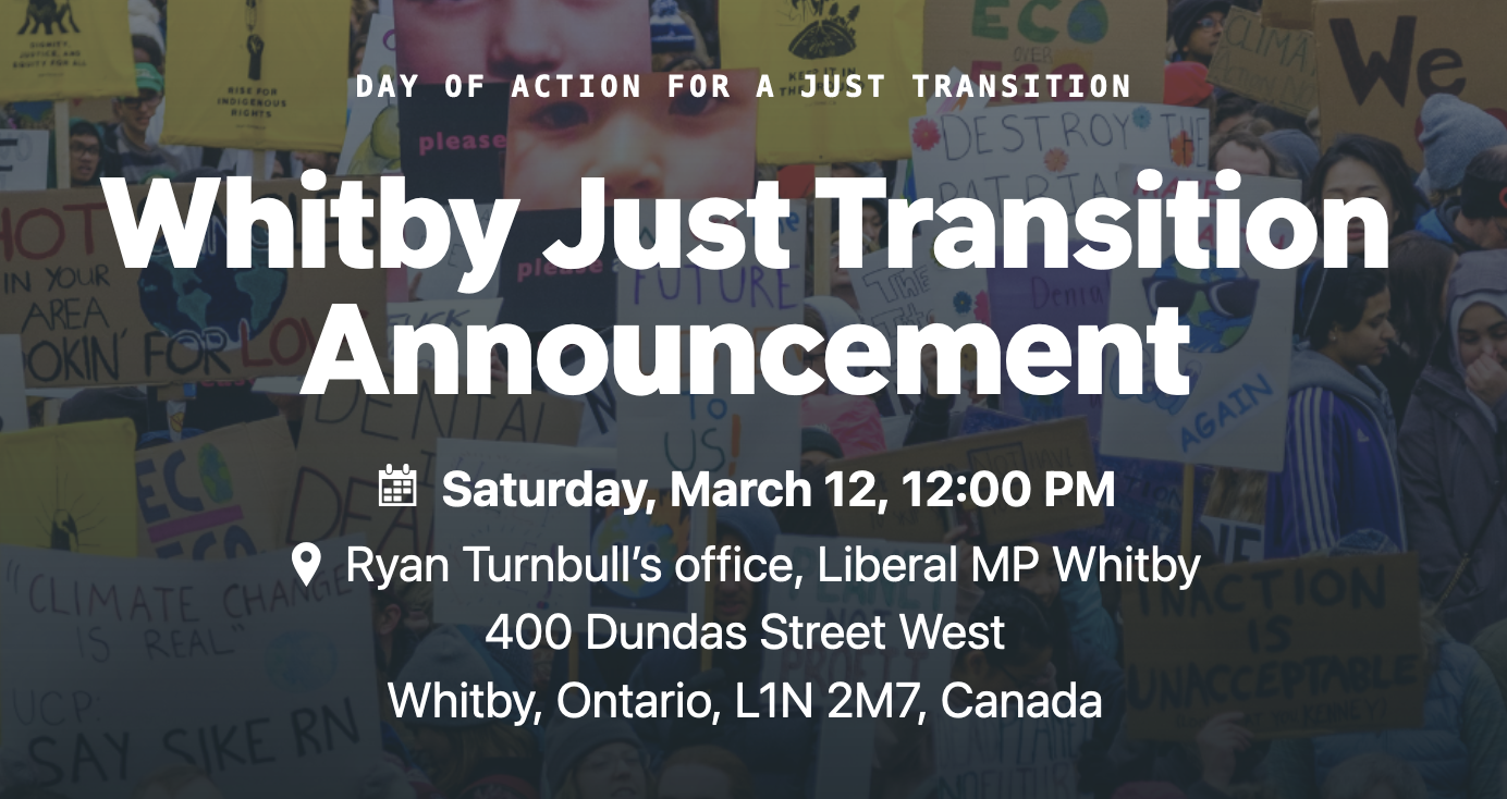 Whitby Just Transition Announcement Saturday, March 12, 2022 12:00 PM 11:55 PM Ryan Turnbull's Office, Liberal MP Whitby 400 Dundas Street West Whitby, ON, L1N 4X9 Canada (map) Google Calendar ICS Mock Ministry of Just Transition unveiling.https://act.350.org/event/jta-doa/25369/